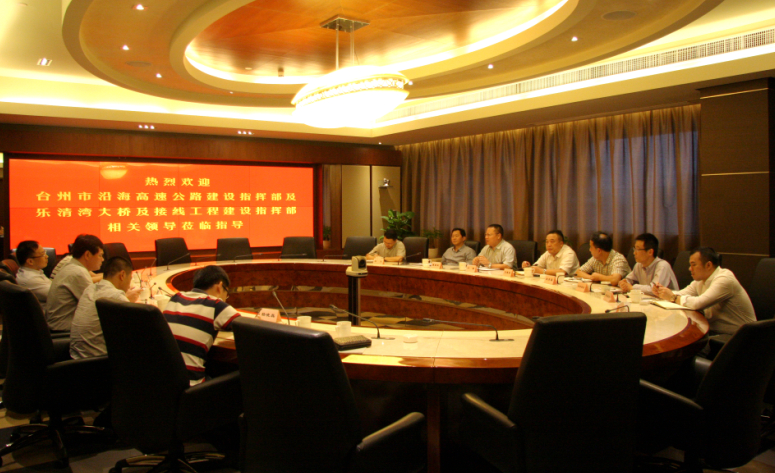 圖為臺(tái)州市沿海高速公路建設(shè)指揮部及樂(lè)清灣大橋及接線工程指揮部領(lǐng)導(dǎo)與物產(chǎn)金屬領(lǐng)導(dǎo)交流洽談